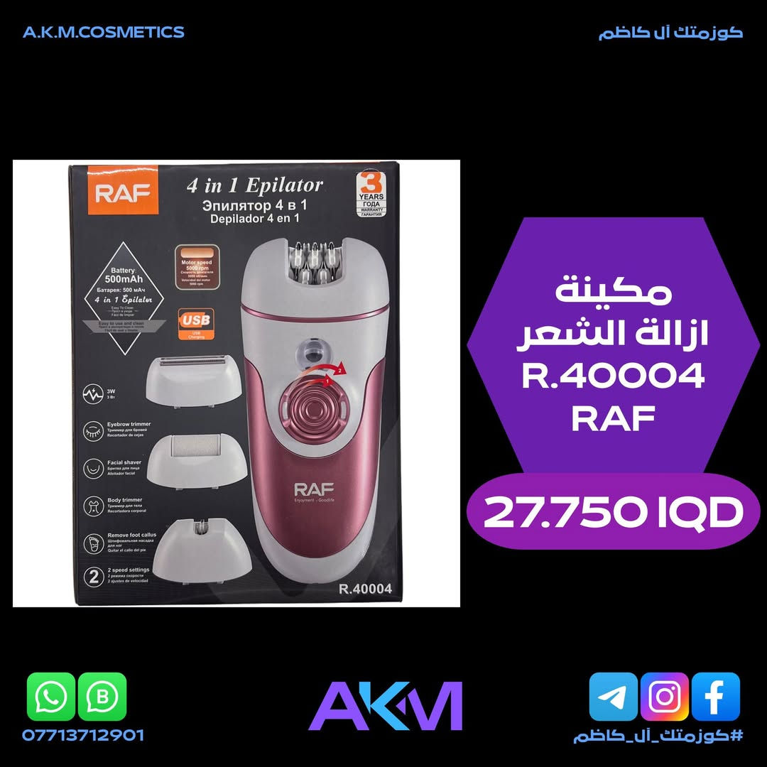 مكينة ازالة الشعر RAF R.40004 الفوائد والمميزات :- - حل شامل 4 في 1 للعناية بالجمال ويجمع بين وظائف متعددة في جهاز لاسلكي واحد. - يعمل على ازالة الشعر بكفاءة ويساعد في تنعيم البشرة وهو مصمم لتوفير تجربة مريحة وسهلة الاستخدام في المنزل. - تعدد الوظائف حيث يشتمل على اربعة رؤوس قابلة للتبديل لتلبية مختلف احتياجات العناية الشخصية. - جهاز لاسلكي وقابل لاعادة الشحن. - يعمل ببطارية مدمجة ويمكن شحنه بسهولة عبر منفذ USB. - يوفر اعدادين للسرعة ليناسب جميع انواع الشعر المختلفة كالناعم والخشن ومناطق الجسم المتنوعة. - يتميز بتصميم انيق ومقبض مريح لسهولة التحكم والاستخدام. - يحتوي محرك قوي لازالة الشعر بسرعة وفعالية. سعر المنتج :- 27.750 دينار عراقي توصيل بغداد :- 3.000 دينار عراقي توصيل المحافظات :- 5.000 دينار عراقي #كوزمتك_آل_كاظم #آل_كاظم #AKM_COSMETICS #AKM **إذا كنت صاحب هذا الإعلان وتريد حذفه لأي سبب، رجاءا أرسل رسالة إلى الدعم الفني**