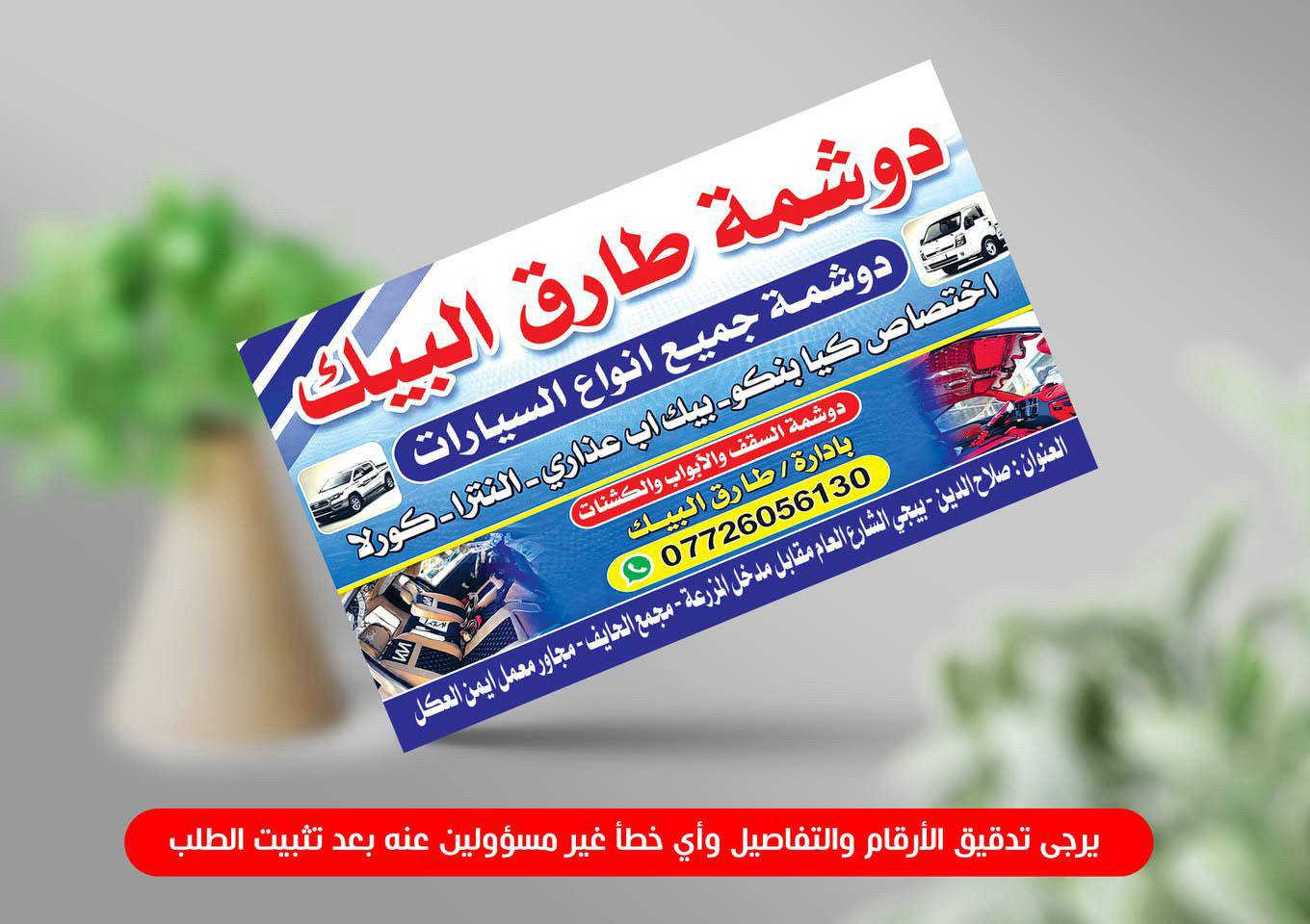 بسم الله الرحمن الرحيم ومن الله التوفيق والبركه تم فتتاح محل دوشمه طارق البيك كافه أنواع السيارات الحديثه والقديمه تغليف كشنات سقفيه ارضيه بطائن دشبول بركع كيه ستاركس بركع كيه حمل الـنـوان بيجي الشارع العام مقابل مدخل المزرعه مجمع الحايف مجاور مـعـمـل ايــمــن الـ عـگـل ومن الله التوفيق زورونا تجدون ما يسركم هـ📞*********** اخوكم طارق البيك