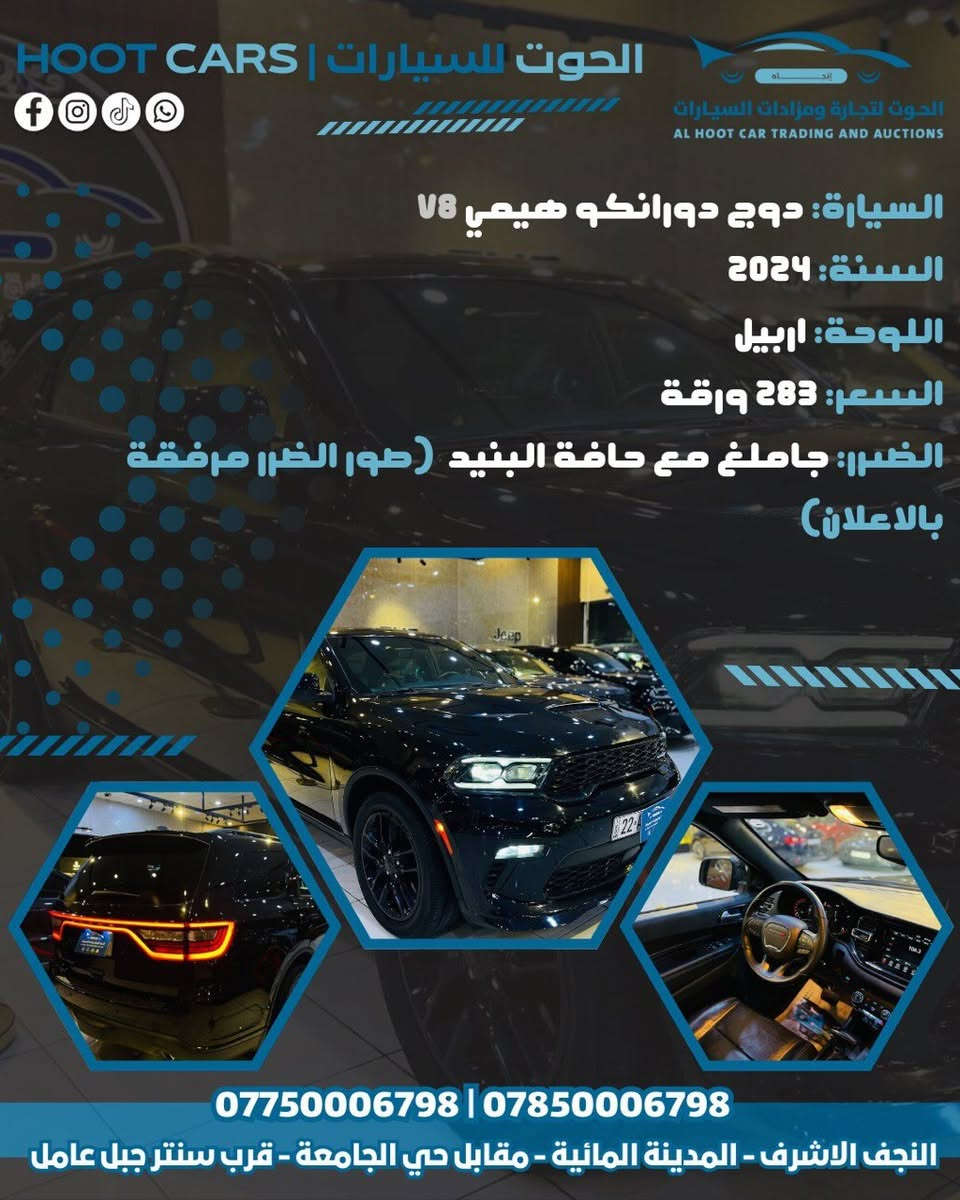 بسم الله ما شاء الله توكلنا على بركة الله. #الحوت_لتجارة_ومزادات_السيارات 🇮🇶 ______________________________________ #اعلان_بيع_سيارة #عروض_مميزة #لاتفوت_الفرصة 🔷السيارة: دوج دورانكو هيمي 🔷سنة الصنع: 2024 🔷اللوحة: اربيل 🔶السعر: 283 ورقة 🔥 🔷الضرر: تبديل وصبغ جاملغ وبنيد. (صور الضرر مرفقة بالاعلان) 🔷ضرر الايرباك: ستيرن ودشبول. 🔷رقم الشاصي: 1C4SDJFT4RC198792 _____________________________________ 🔷المواصفات: 🔹حجم المحرك 8 سلندر HEMI 5.7L 🚀 🔹عداد المسافة 9 الف ميل 🔹رادار جانبي 🔹تنبيه الخروج عن المسار 🔹حساسات خلفية 🔹كراسي مخمل 🔹كراسي كهرباء 🔹ويل كب حجم 20 انج مع اطارات بحالة جيدة 🔹وضعيات قيادة 🔹لايتات LED بالكامل 🔹شاشه تحكم بالايعازات 🔹تحكم ستيرن جهتين 🔹بصمة ابواب وتشغيل 🔹مع باقي المواصفات الاعتيادية ———————————————————————— ☎️ الاتصال : *********** *********** 📍النجف الاشرف - المدينة المائية - مقابل حي الجامعة - قرب سنتر جبل عامل. 🔹TIKTOK https://www.tiktok.com/@hoot.cars?_r=1&_t=ZS-93D4aRKWGKQ 🔹INSTAGRAM https://www.instagram.com/hoot.cars?igsh=MWZkcjE5cHhja2Rleg== 🔹WEBSITE https://hootcars.autos