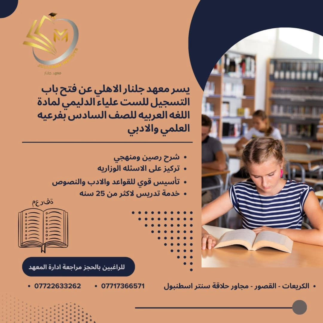 🌿✨ العربية… ذوق وفهم وتميّز ✨🌿 بكل فخر يعلن معهد جلنار الأهلي عن فتح باب التسجيل مع 👩🏫 الأستاذة القديرة علياء الدليمي مدرّسة مادة اللغة العربية – السادس الإعدادي 📚 بخبرة تتجاوز 25 سنة من العطاء والتألق 🌟 وصيت أكاديمي معروف بنتائج مشرفة ونِسب نجاح نفتخر بها عامًا بعد عام 💯 📖 أسلوب رصين يبسّط القواعد 📖 تحليل مميز للنصوص والأدب 📖 تدريب مكثف على الأسئلة الوزارية 📖 متابعة دقيقة تبني طالب واثق من إجابته ✍🏻 لأن العربي مو حفظ بس… العربي فهم، ذوق، وثقة بالكلمة 🤍 📌 آلية التسجيل: مراجعة إدارة المعهد واستلام كارت التسجيل أولًا، ثم إرسال الاسم الثلاثي + الصف على أرقام المعهد لتثبيت الحجز رسميًا. 📍 معهد جلنار الأهلي – الكريعات / القصور 📞 *********** – *********** 🚌 خط نقل خاص: *********** ✨ المقاعد محدودة… والاختيار الصح يصنع الفرق ✨