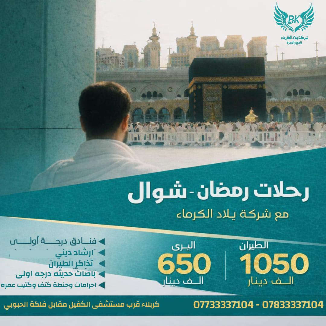 عرض خاص لفترة محدودة ❌عمــُـرة 🌙 رمضــان + شوال 🕋 ⭕ بــــــرآ بـ 650 الف فقط ⭕ طيران بـ 1050الف فقط 🔴 #ملاحظه في حاله إضافة 3 وجبات طعام البري يضاف 100 الف ✅ 3 وجبـــات طعــــام للطيران 150 الف ✅ برنامج كامل شامل جميع الخدمات ( نقل - فيزا - السكن مدينه مركزيه - مكه محبس الجن - هدايا المعتمرين - كافة المزارات مكه والمدينه ) ❌ متوفر نظام اقساط لحاملي ماستر رافدين ❌ 🔴 تاريخ الرحلات 2026/2/25. عمره رمضان 2026/3/5. عمره رمضان 2026/3/15. عمره رمضان + شوال للاستفسار 📞 أو للحجز💺 شركة بلاد الكرماء: كربلاء - قرب مستشفى الكفيل- مقابل فلكة الحبوبي *********** / اتصال *********** / واتس اب - اتصال *********** / زين كاش *********** واتس اب - اتصال
