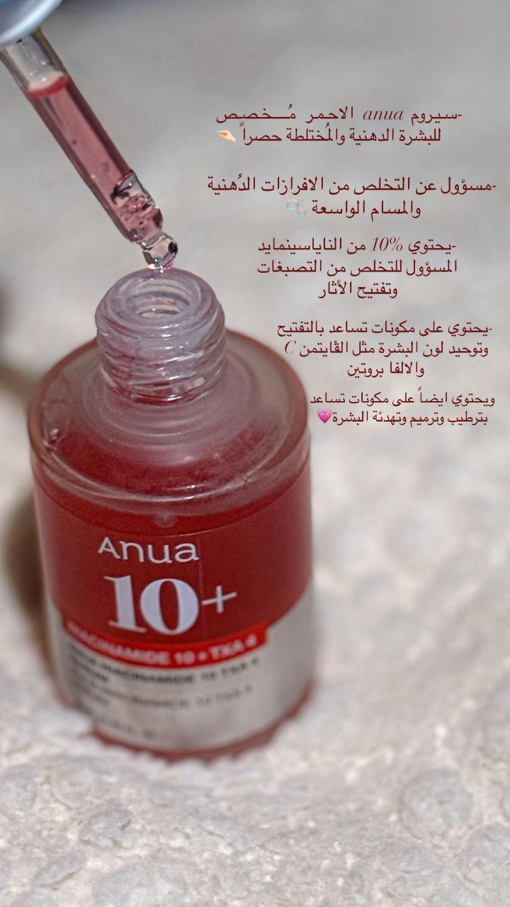 سيروم Anua نياكيناميد 10% (المعروف بـ Niacinamide 10 + TXA 4) هو سيروم كوري مشهور لتفتيح البشرة وتحسين مظهرها. هذه أهم فوائده 👇 ✨ فوائد سيروم انوا نياكيناميد 10 1️⃣ تفتيح البشرة وتوحيد اللون يساعد النياكيناميد على تقليل إنتاج الميلانين، فيخفف التصبغات والبقع الداكنة وآثار الحبوب. � 2️⃣ تقليل المسام والدهون ينظم إفراز الزيوت، فيجعل المسام تبدو أصغر ويمنح البشرة ملمس أنعم. � 3️⃣ تقليل آثار الحبوب والتصبغات العنيدة وجود حمض الترانيكساميك مع النياكيناميد يساعد على تلاشي آثار الحبوب والكلف وتفاوت اللون. � 4️⃣ ترطيب وتقوية حاجز البشرة يحتوي على هيالورونيك أسيد وسيراميدات تساعد في حبس الرطوبة وتقوية الجلد. � 5️⃣ تهدئة الاحمرار والالتهاب النياكيناميد معروف بخصائصه المهدئة، فيناسب البشرة الحساسة أو المعرضة للحبوب. � 6️⃣ يمنح إشراقة ونضارة للبشرة الاستخدام المنتظم يجعل البشرة أصفى وأنعم وأكثر إشراقاً. **إذا كنت صاحب هذا الإعلان وتريد حذفه لأي سبب، رجاءا أرسل رسالة إلى الدعم الفني**