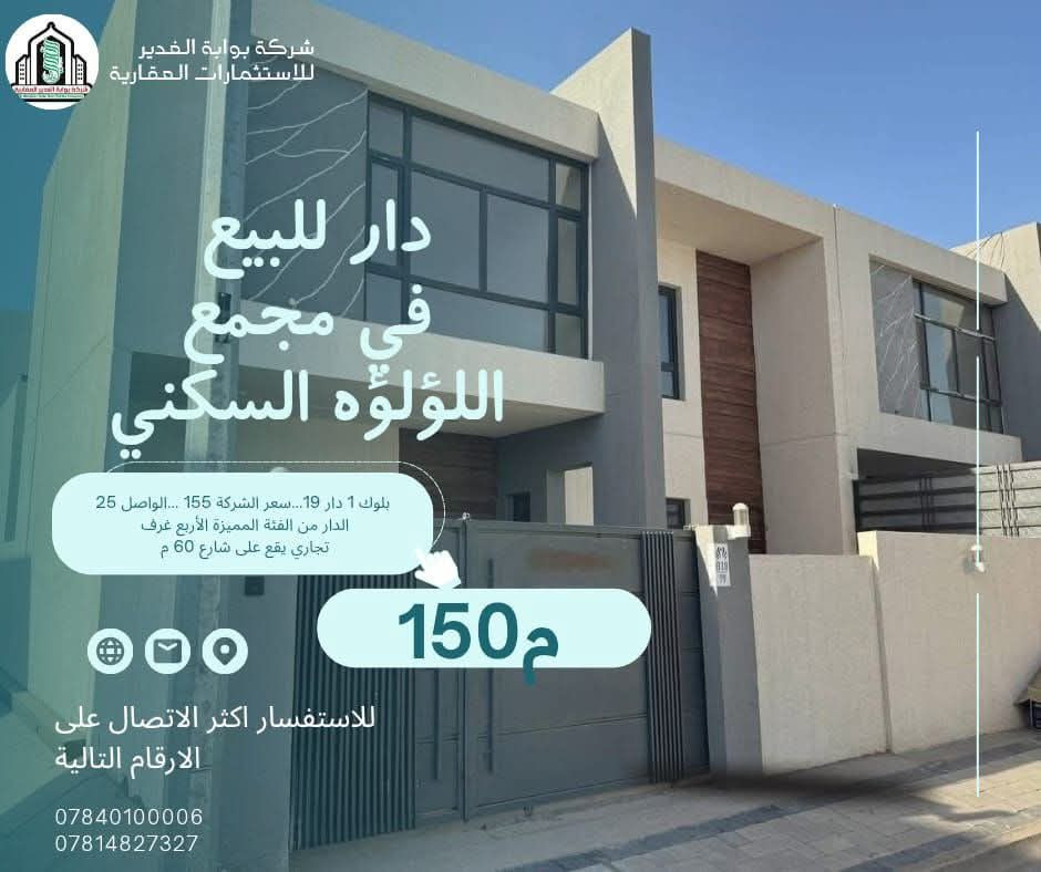 دار للبيع بمجمع اللؤلؤة مساحة 150م مرحلة ثانيه مميز بسعر 155مليون واصل 25 مليون المميزات # يقع على شارع 60م القوسي # 4 غرف نوم # تطلوعة مناسبة جدا للاستفسار*********** واتس اب او اتصال