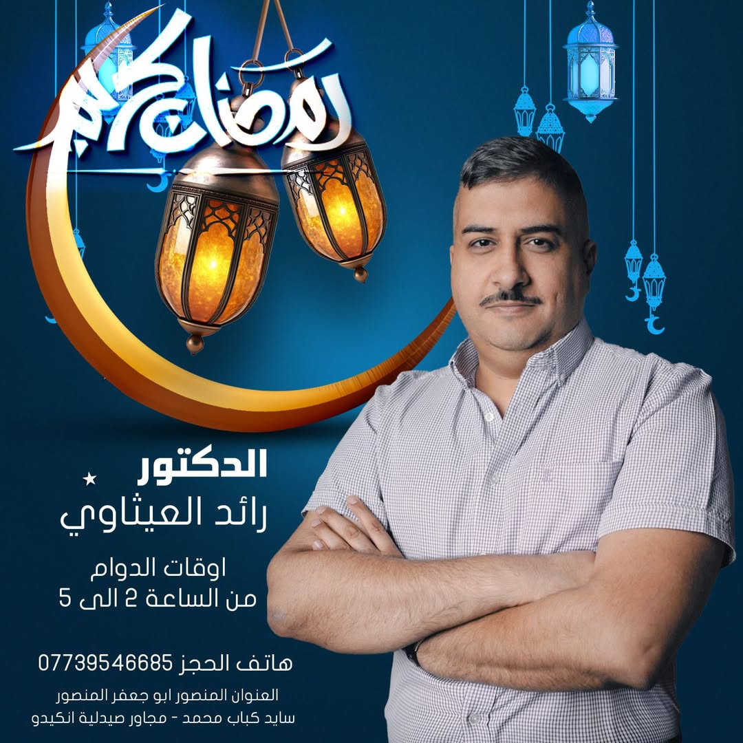 رمضان مبارك مراجعينا الأعزاء أعاده الله علينا وعليكم بالخير واليمن والبركات أوقات الدوام في العيادة ستكون كالاتي لشهر رمضان المبارك من 2:00 إلى 5:30 ان شاء الله الدكتور رائد العـيثاوي استاذ تدريسي بالجامعة العراقية اختصاص طب دماغ واعصاب وجملة العصبية وصرع عضلات. 📍عنواننا المنصور شارع ابو جعفر المنصور سايد مطعم كباب محمد فوق صيدليه انكيدو 📱 للحجز ارسللونا الاسم *********** 🗓️ ايام الدوام كل ايام الاسبوع ما عدا الجمعة والاتصال بنفس اليوم للحجز.