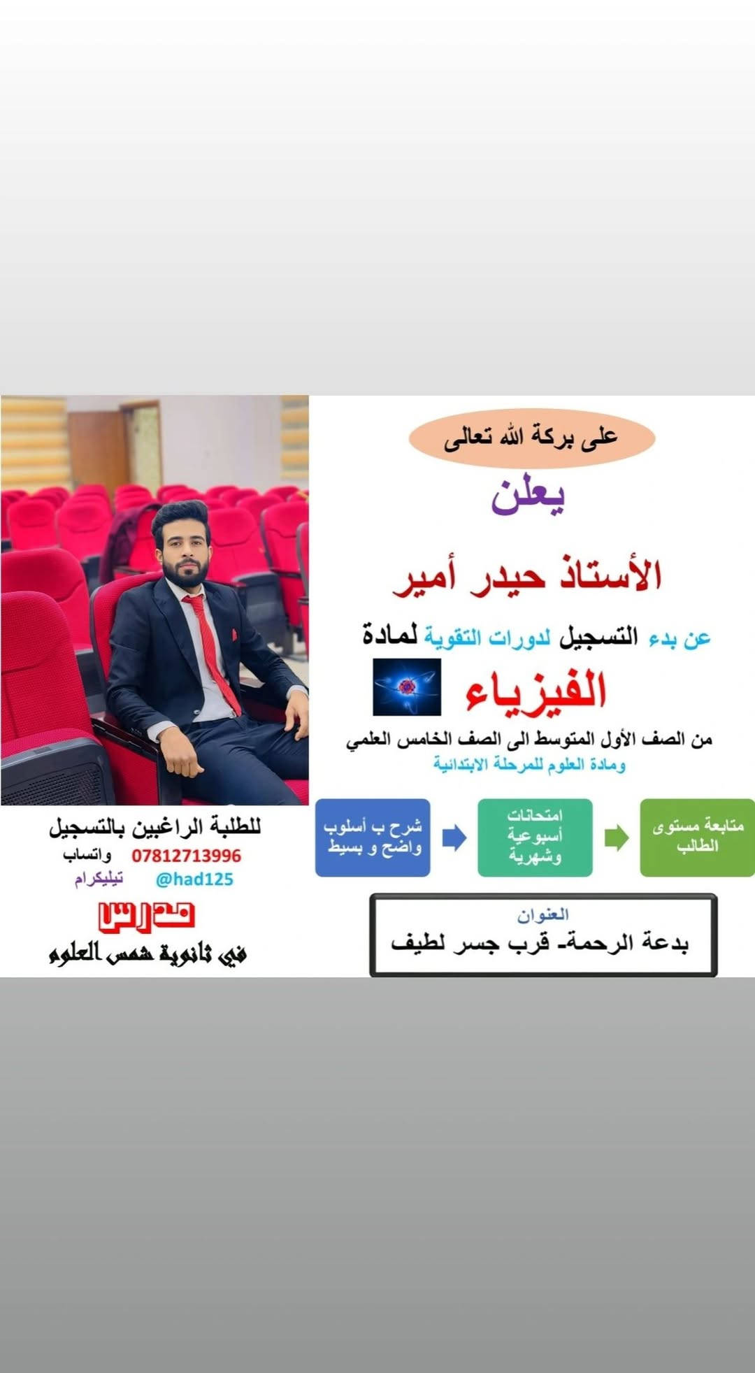على بركة الله وتوفيقة اعلان افتتاح دورات تقوية مادة الفيزياء طريقة الشرح با اسلوب سهل وبسيط للطالب للاستفسار أكثر مراسلة الحساب أو الاتصال على الرقم *********** ..