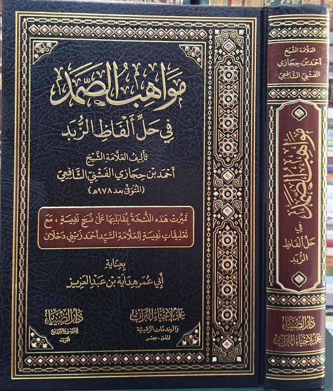مواهب الصمد في حل ألفاظ الزبد و هو شرح مفصل ومشهور لمنظومة "صفوة الزبد" في الفقه الشافعي، والتي ألفها الإمام ابن رسلان الرملي. يشرح الكتاب قواعد الفقه، العبادات، المعاملات، والأحكام الشرعية وفقاً للمذهب الشافعي بأسلوب يوضح ألفاظ المنظومة ويفك عباراتها، وهو من تأليف الإمام أحمد بن حجازي الفشني الشافعي،ومعه تعليقات نفسية للعلامة احمد زيني دحلان، بعناية ابي عمر هداية بن عبد العزيز طبعة دار الضياء شامو سعر 33 الف مكتبة عبدالله علي مراد كركوك خان القلعة للطلب والاستفسار الاتصال على رقم *********** يوجد توصيل