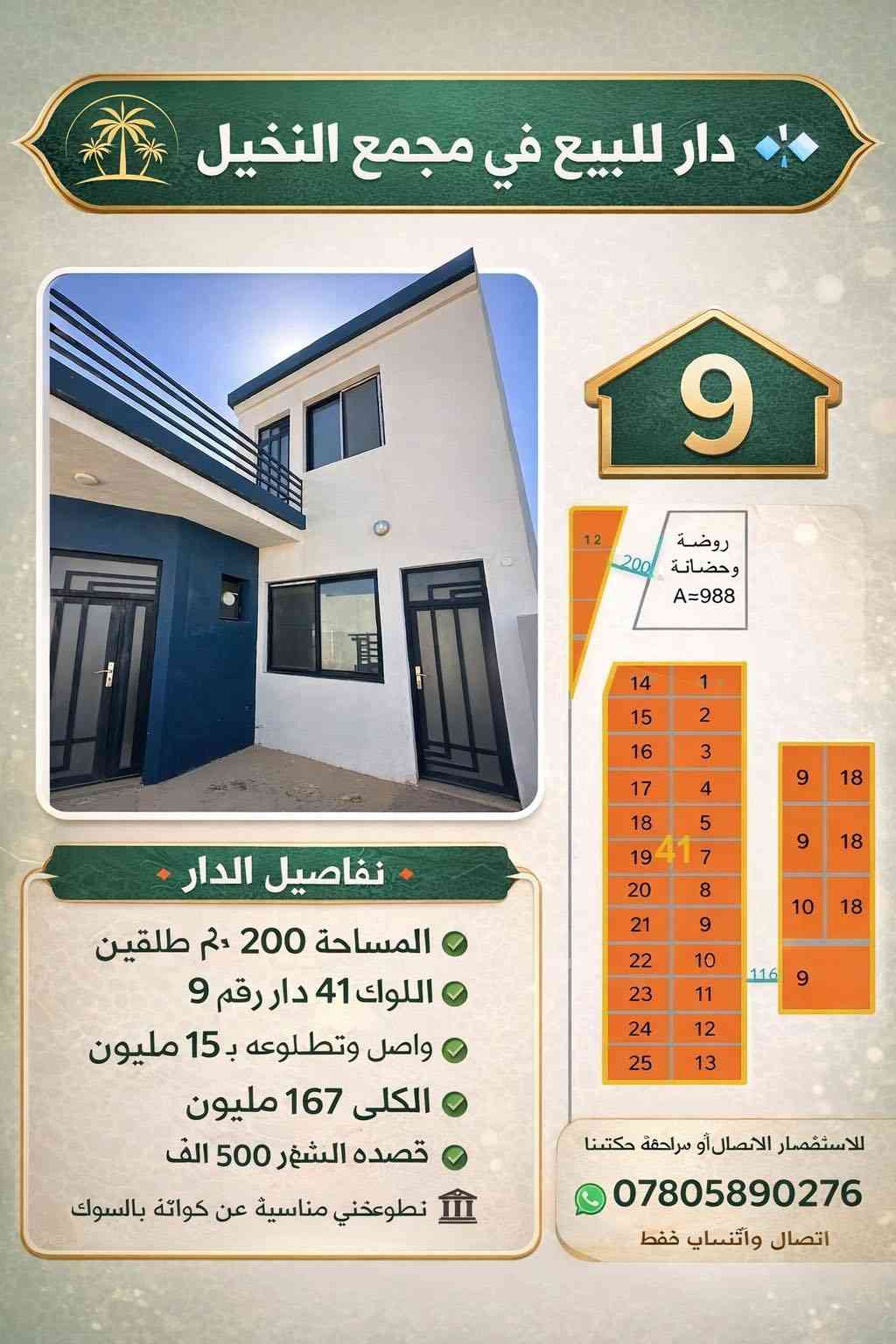 🔹 دار للبيع في مجمع النخيل 🔹 🔹 دار للبيع في مجمع النخيل 🔹 🔻تفاصيل الدار 🟢 المساحة 200 م2 طابقين 🟢 البلوك 41 🟢 واصل 60 مليون وتطلوعه ب 15 مليون 🟢 الكلي 167 مليون 🟢قصده الشهر 500 الف 🟢 تطلوعته صدكني مناسبه عن خواته بالسوك 🏦 🔻للاستفسار الاتصال على الرقم التالي او مراجعة مكتبنا *********** . اتصال واتساب فقط