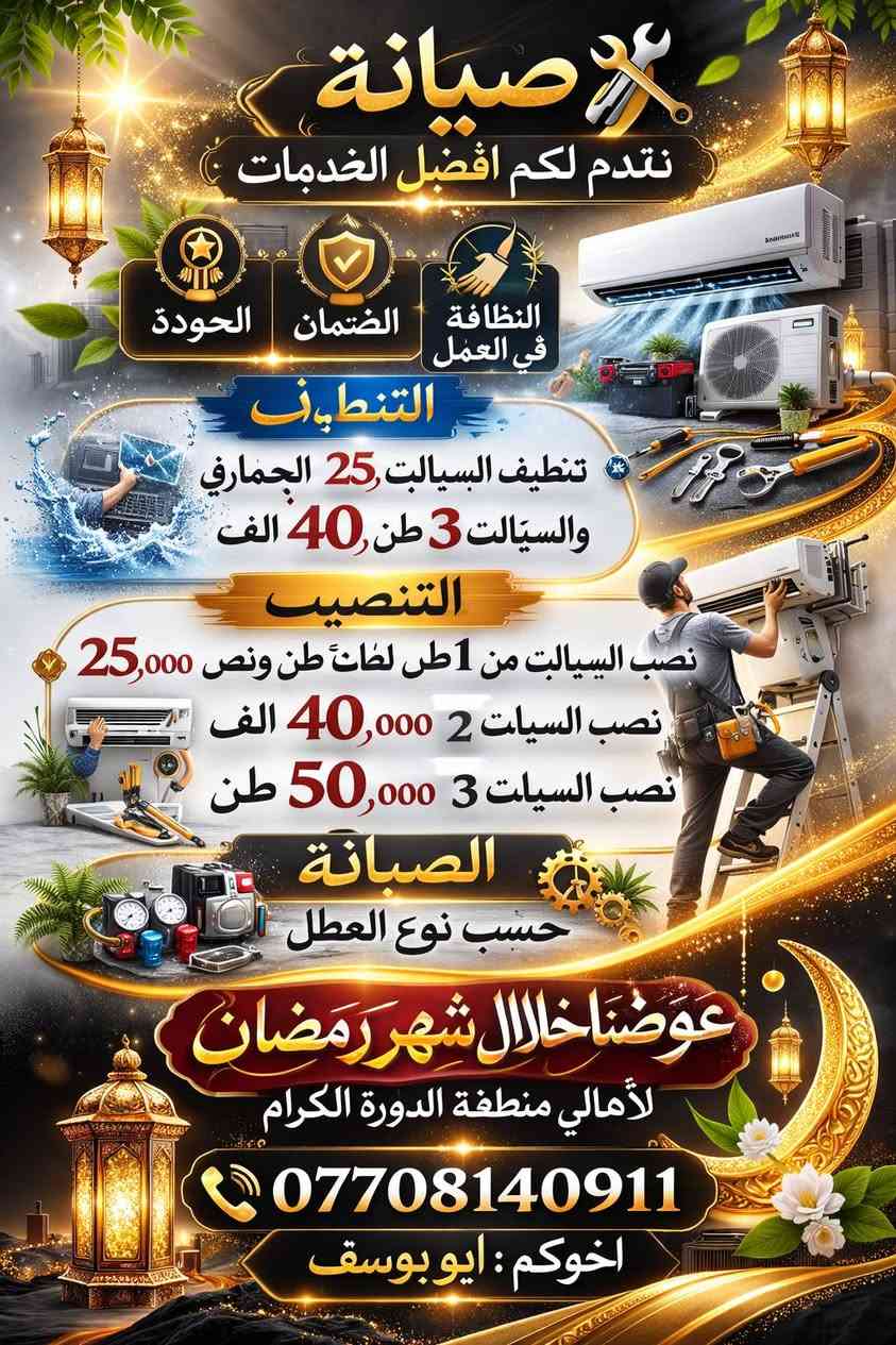 🔧❄️ صيانة تقدم لكم أفضل خدمات السبالت ❄️🔧 نقدم لكم خدمة موثوقة بجودة عالية وخبرة مميزة لنضمن راحتكم دائماً ✅ الجودة العالية ✅ ضمان على العمل ✅ النظافة والدقة أثناء التنفيذ 🧼 التنظيف تنظيف السبالت الجداري: 25 ألف تنظيف سبلت 3 طن: 40 ألف 🛠️ التنصيب نصب السبالت من 1 طن إلى طن ونص: 25 ألف نصب سبلت 2 طن: 40 ألف نصب سبلت 3 طن: 50 ألف 🔩 الصيانة صيانة السبالت حسب نوع العطل 🎁 عروض خاصة خلال شهر رمضان 🌙 لأهالي منطقة الدورة الكرام 📞 للحجز والاستفسار: *********** 🤝 أخوكم: أبو يوسف