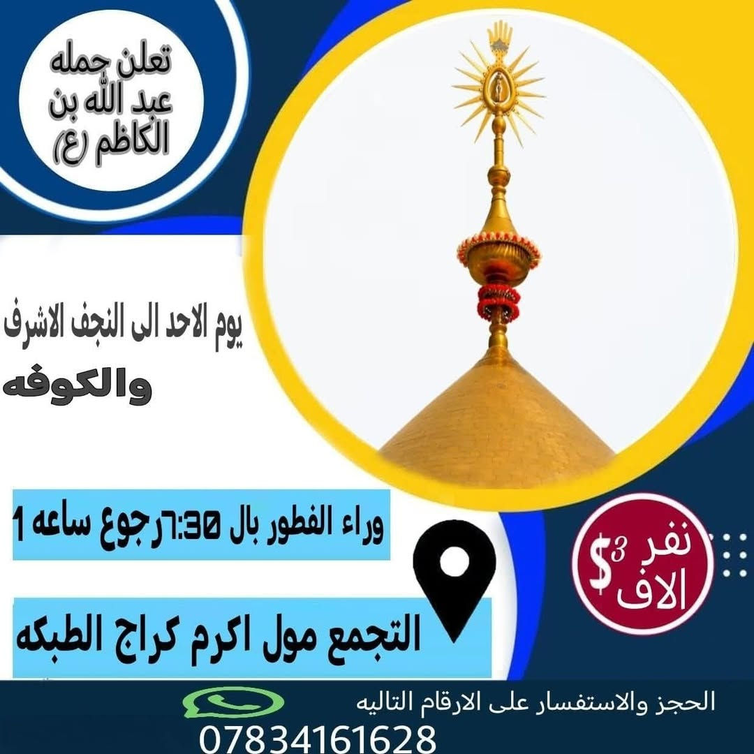 السلام عليكم حمله الامام عبدالله ابن الكاظم ع في غماس سوف تنطلق يوم الأحد إلى مسجد الكوفه المقدسه وميثم التمار والامام علي ع افضل الصلاة والسلام سيكون الانطلاقه بعد الصلاه و الافطار والعوده الساعه 1 لليلا وسعر النفر الواحد 3 دينار فقط والحجز والاستفسار ع هذا الرقم *********** أو مراسله تلك الحساب