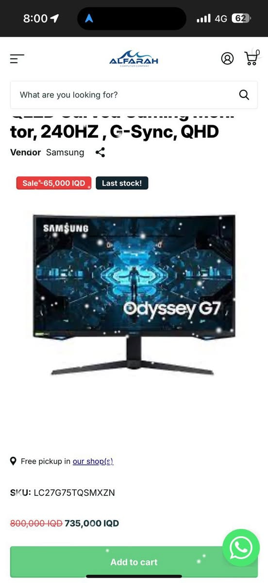 ب٥٠٠ الف 2k شاشة مونيتر سامسونج ( اوديسي G7 ) ٠ قياس 27 ( كيرف ) مقوسة ٠ تقنية nvidia G-SYNC ٠ تردد 240 هرتز ٠ سرعة استجابة ( 1ms) ٠ QLED **إذا كنت صاحب هذا الإعلان وتريد حذفه لأي سبب، رجاءا أرسل رسالة إلى الدعم الفني**