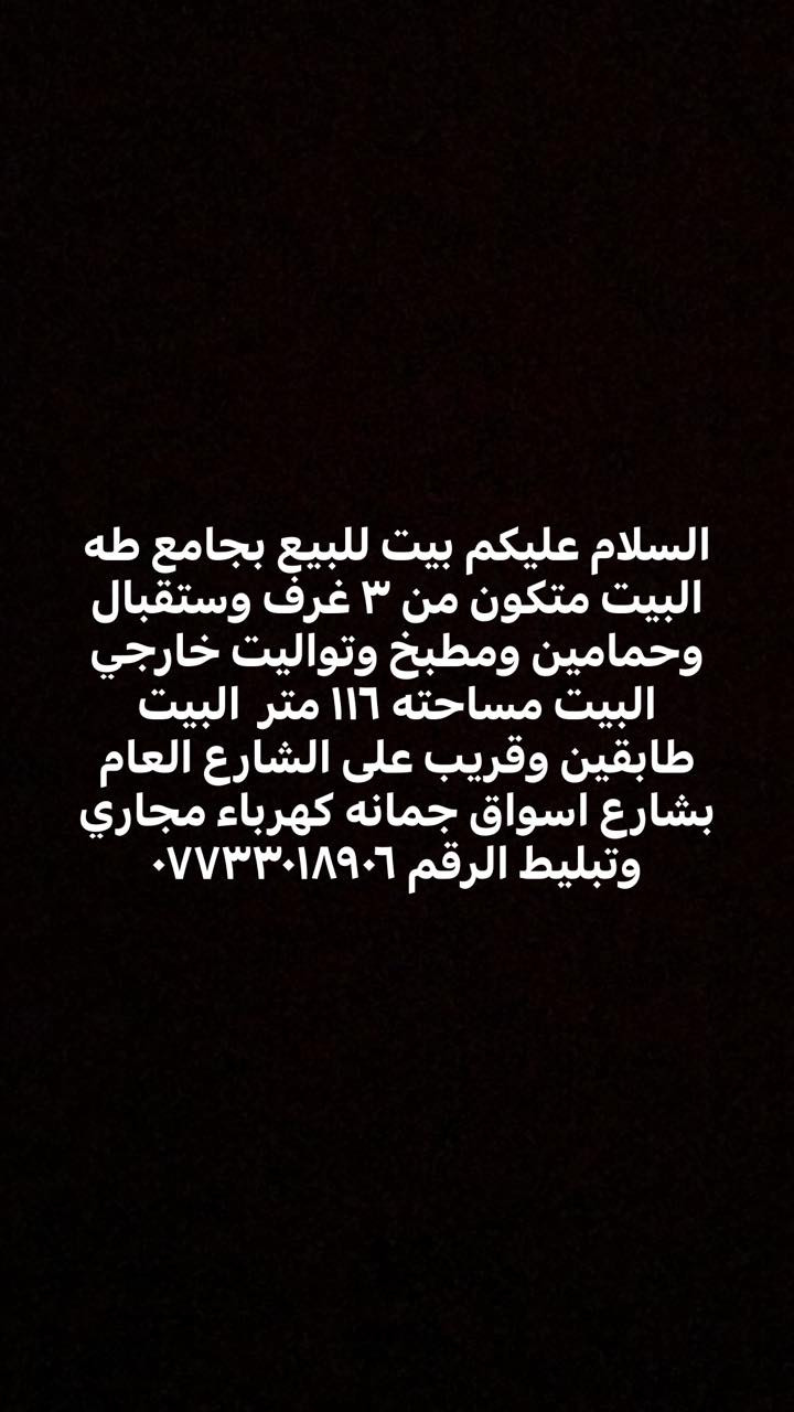 السلام عليكم بيت للبيع بجامع طه البيت متكون من ٣ غرف وستقبال وحمامين ومطبخ وتواليت خارجي البيت مساحته ١١٦ متر البيت طابقين وقريب على الشارع العام بشارع اسواق جمانه كهرباء مجاري وتبليط الرقم ***********