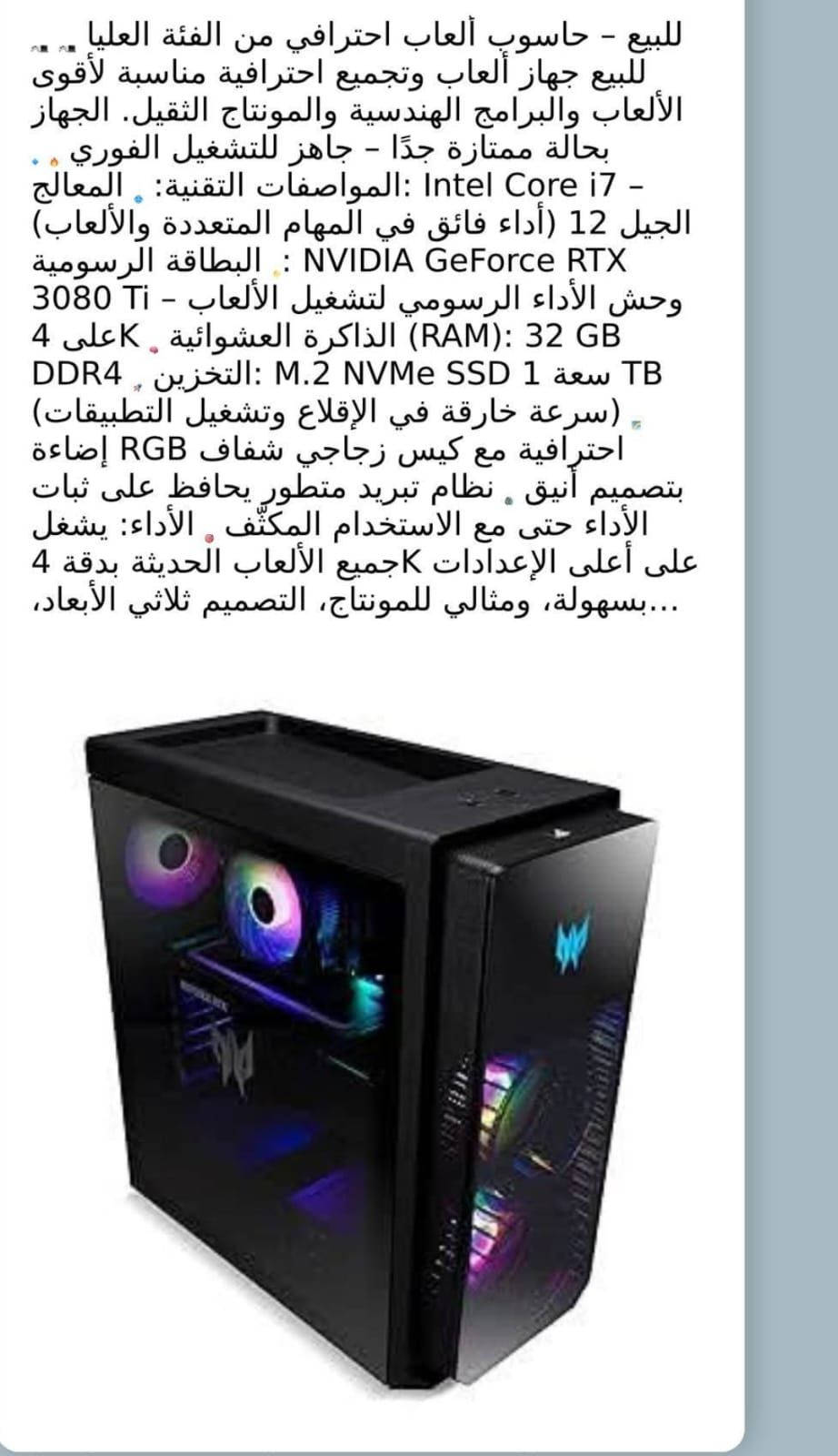 جهاز يشغّل أقوى الألعاب بدون أي تنازل بالجودة… هذا الجهاز ما يتكرر بسهولة 👑 💰 السعر: 1,600,000 دينار عراقي (مقابل أداء فئة عليا يعيش وياك سنوات) 🖥 المواصفات الجبارة: ⚡ Intel Core i7 الجيل 12 – قوة معالجة عالية للألعاب الثقيلة والمونتاج ⚡ RTX 3080 Ti – أداء 4K Ultra حقيقي وسلاسة حتى بأقوى الألعاب ⚡ 32GB RAM DDR4 – تعدد مهام بدون تهنيج ⚡ 1TB NVMe SSD – سرعة تحميل خارقة ⚡ كيس احترافي RGB بزجاج جانبي أنيق ⚡ تبريد متطور يحافظ على ثبات الأداء حتى تحت الضغط 🎮 الأداء؟ ✔ يشغّل أحدث الألعاب على أعلى إعدادات ✔ مناسب للبث المباشر وصناعة المحتوى ✔ مثالي للمونتاج والتصميم ثلاثي الأبعاد **إذا كنت صاحب هذا الإعلان وتريد حذفه لأي سبب، رجاءا أرسل رسالة إلى الدعم الفني**