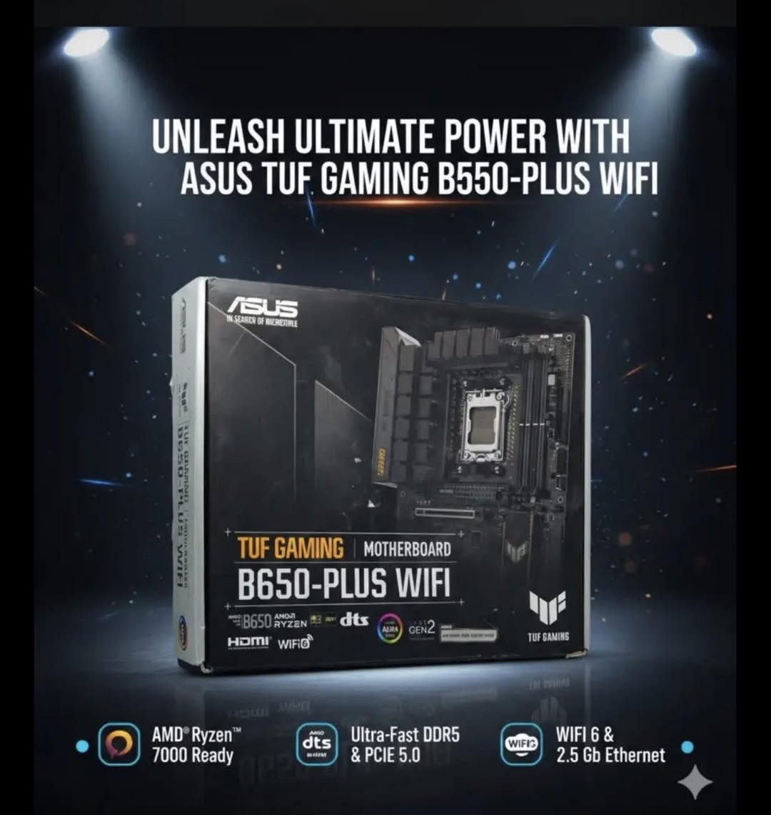 ASUS TUF Gaming B650-PLUS WIFI – المواصفات هذه اللوحة الأم موجهة للألعاب ومعالجات AMD الحديثة، ومواصفاتها كالتالي: 🔹 المعالج (CPU) مقبس AM5 تدعم معالجات AMD Ryzen 7000 Series جاهزة أيضاً لبعض أجيال Ryzen الأحدث (حسب تحديث الـ BIOS) 🔹 الرام (Memory) نوع DDR5 حتى 128GB (4 شقوق RAM) تدعم سرعات عالية (تختلف حسب المعالج) 🔹 كرت الشاشة والتوسعة منفذ PCIe 5.0 x16 لكرت الشاشة منافذ PCIe إضافية للتوسعة 🔹 التخزين منافذ M.2 NVMe سريعة (بعضها PCIe 5.0) منافذ SATA للأقراص العادية SSD/HDD 🔹 الشبكة والاتصال WiFi 6 بلوتوث منفذ LAN بسرعة 2.5Gb 🔹 الصوت تقنية صوت DTS كرت صوت مدمج عالي الجودة 🔹 المنافذ الخلفية USB 3.2 HDMI منافذ Type-C (حسب الإصدار) ***********