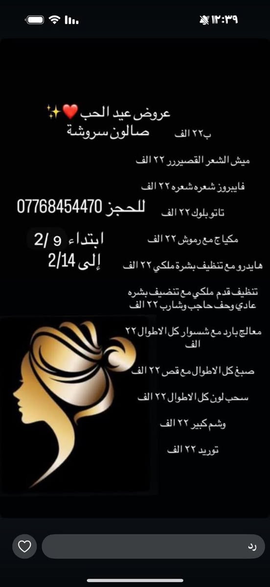 صالون سروش صليخ قرب مجمع الريان 🌚 **إذا كنت صاحب هذا الإعلان وتريد حذفه لأي سبب، رجاءا أرسل رسالة إلى الدعم الفني**